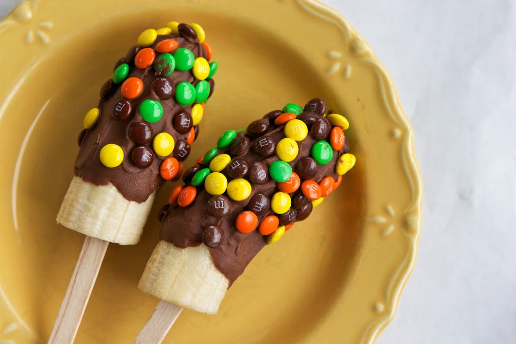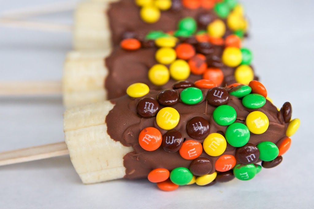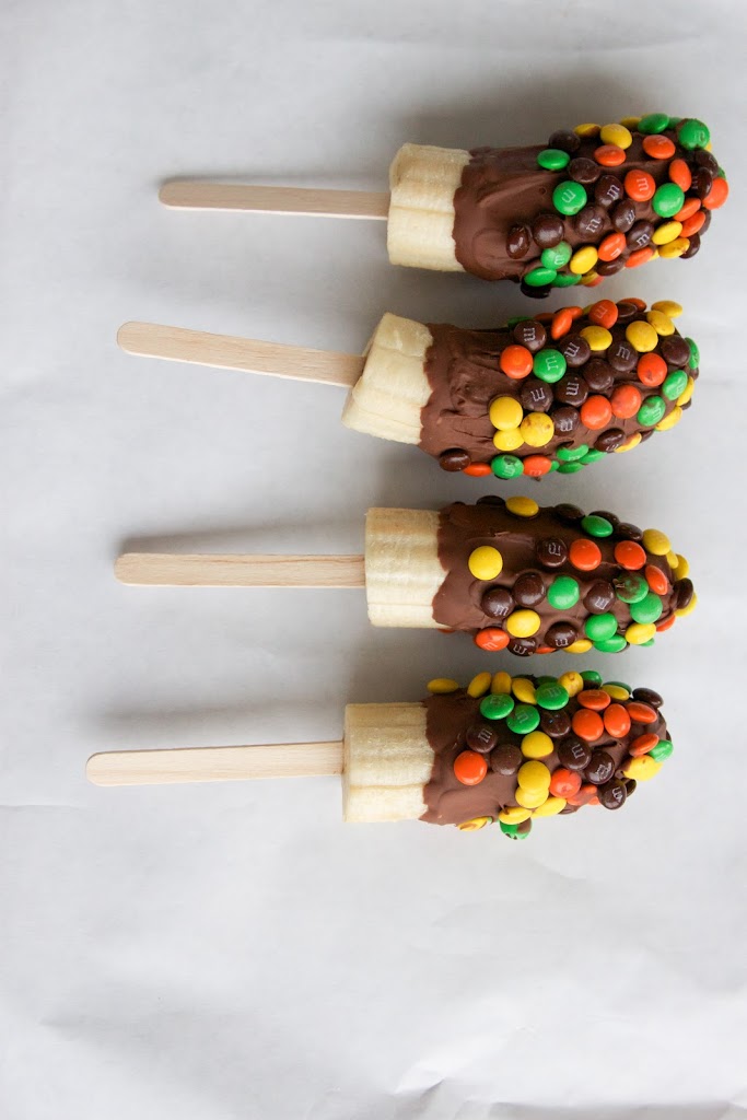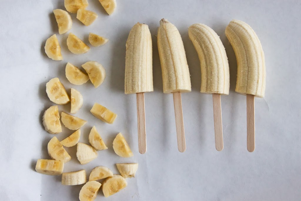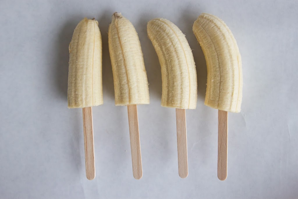 1.) Banane prerežemo na pol in v njih vstavimo palčke do polovice.