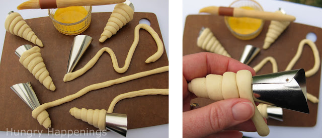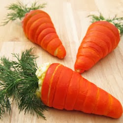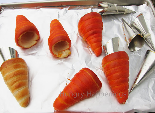 Pecite 6-8min, dokler rahlone porjavijo. Nato počakajte 5min, da se testo malo ohladi, saj boste korenčke tako lažje vzeli iz tulcev. Pazljivo primite korenček z eno roko, z drugo pa obrnite tulec za šamrole.