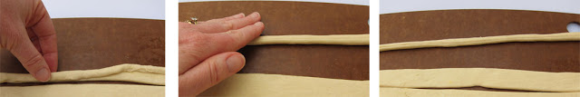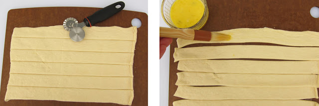 Uporabite rezilo za pico in razrežite testo na 6 enakih trakov. Enega namažite z jajcem.